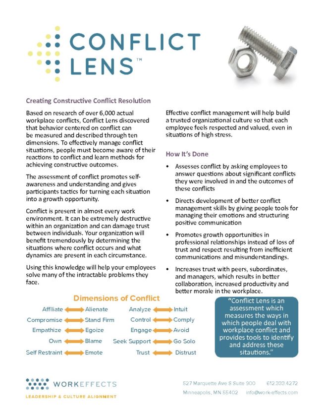 Creating Constructive Conflict Resolution   Based on research of over 6,000 actual workplace conflicts, Conflict Lens discovered that behavior centered on conflict can be measured and described through ten dimensions. To effectively manage conflict situations, people must become aware of their reactions to conflict and learn methods for achieving constructive outcomes. The assessment of…